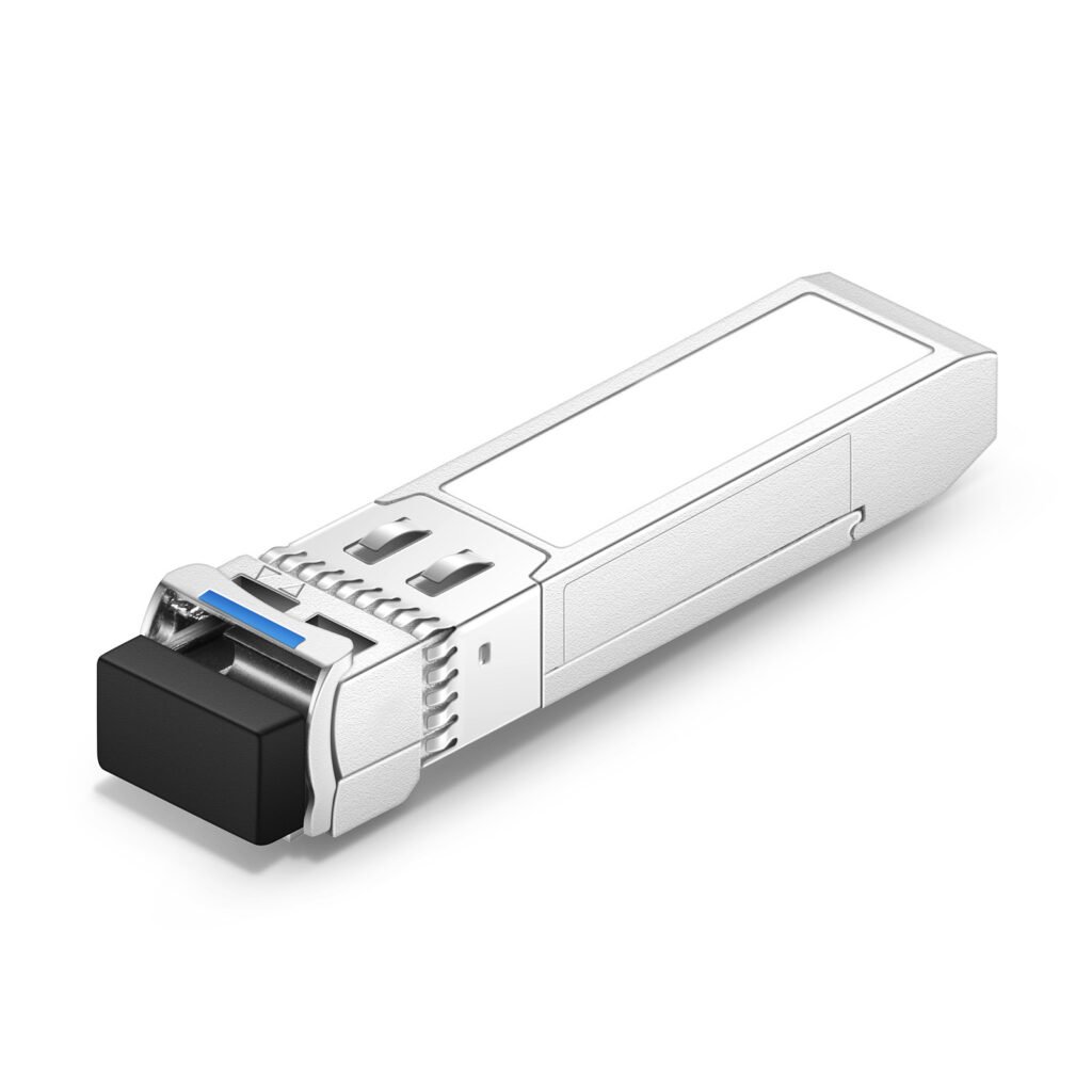 The SFP+ transceiver supports up to 60km over OS2 SMF via an LC simplex connector. This 10G BiDi SFP+ transceiver, featured with data transmission over a single strand of fiber, the one transceiver transmits a 1330-nm channel and receives a 1270-nm signal, whereas the other BiDi SFP+ optics transmits at a 1270-nm wavelength and receives a 1330-nm signal.